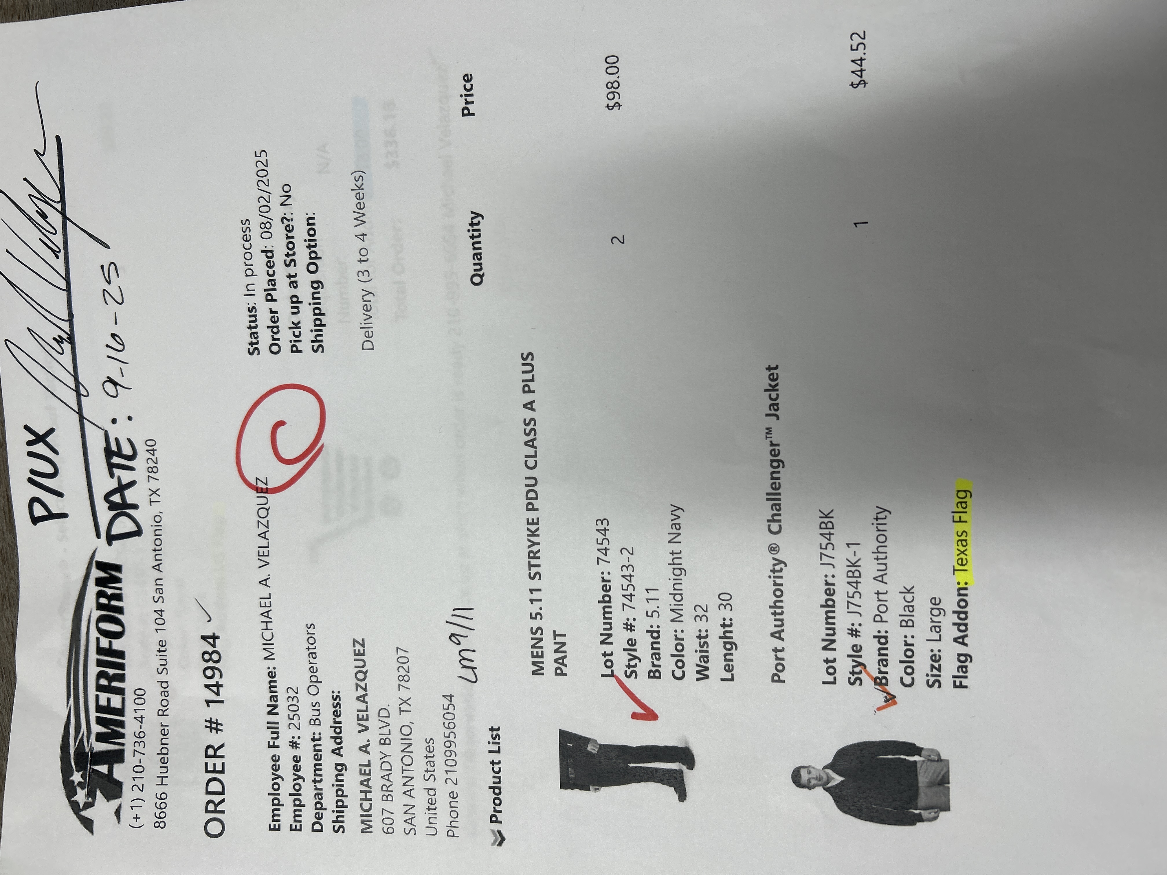 Will pick up at store when order is ready 210-995-6054 Michael Velazquez #25032