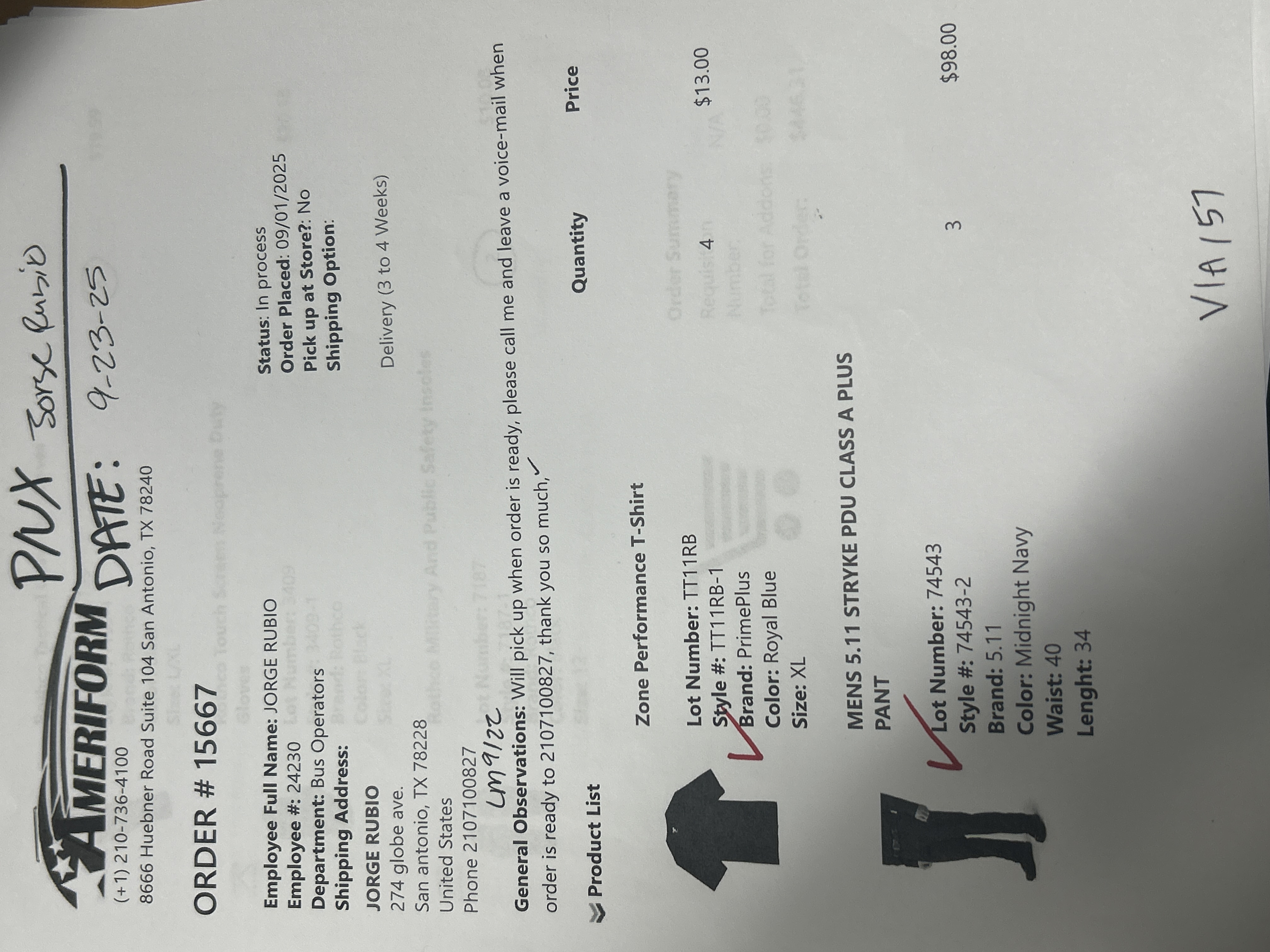 Will pick up when order is ready, please call me and leave a voice-mail when order is ready to 2107100827, thank you so much,