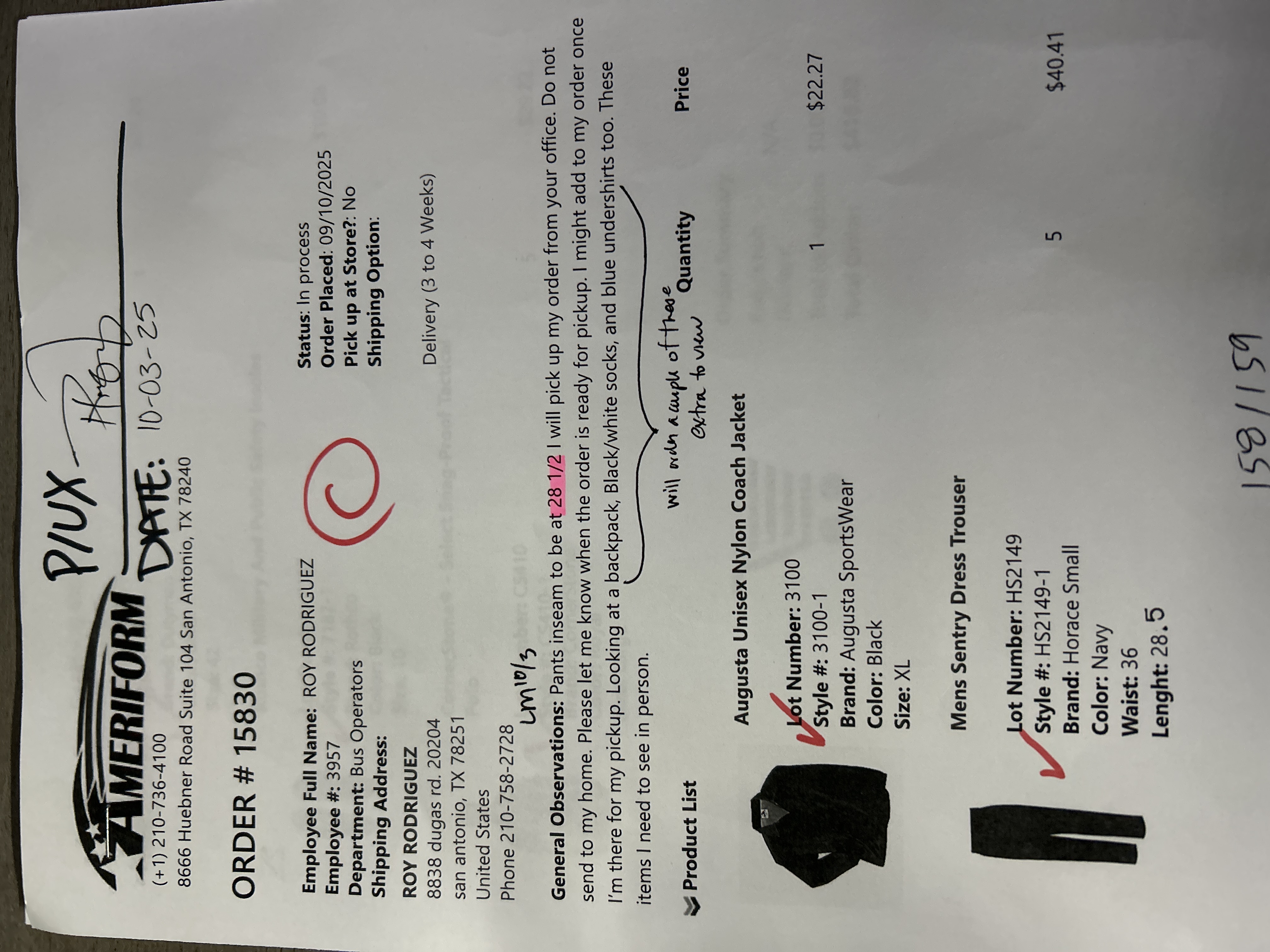Pants inseam to be at 28 1/2 I will pick up my order from your office. Do not send to my home. Please let me know when the order is ready for pickup. I might add to my order once I’m there for my pickup. Looking at a backpack, Black/white socks, and blue undershirts too. These items I need to see in person.