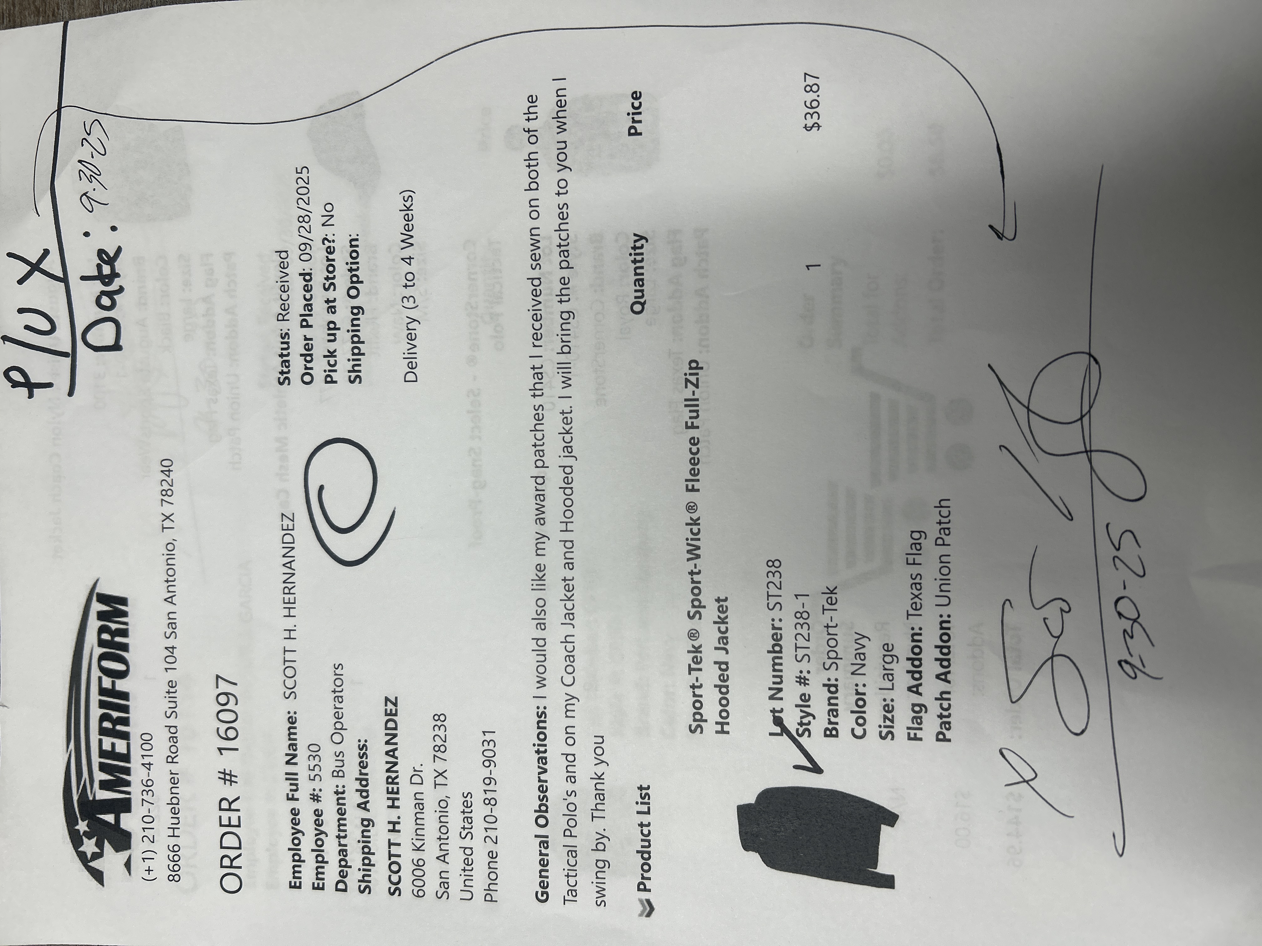 I would also like my award patches that I received sewn on both of the Tactical Polo's and on my Coach Jacket and Hooded jacket. I will bring the patches to you when I swing by. Thank you