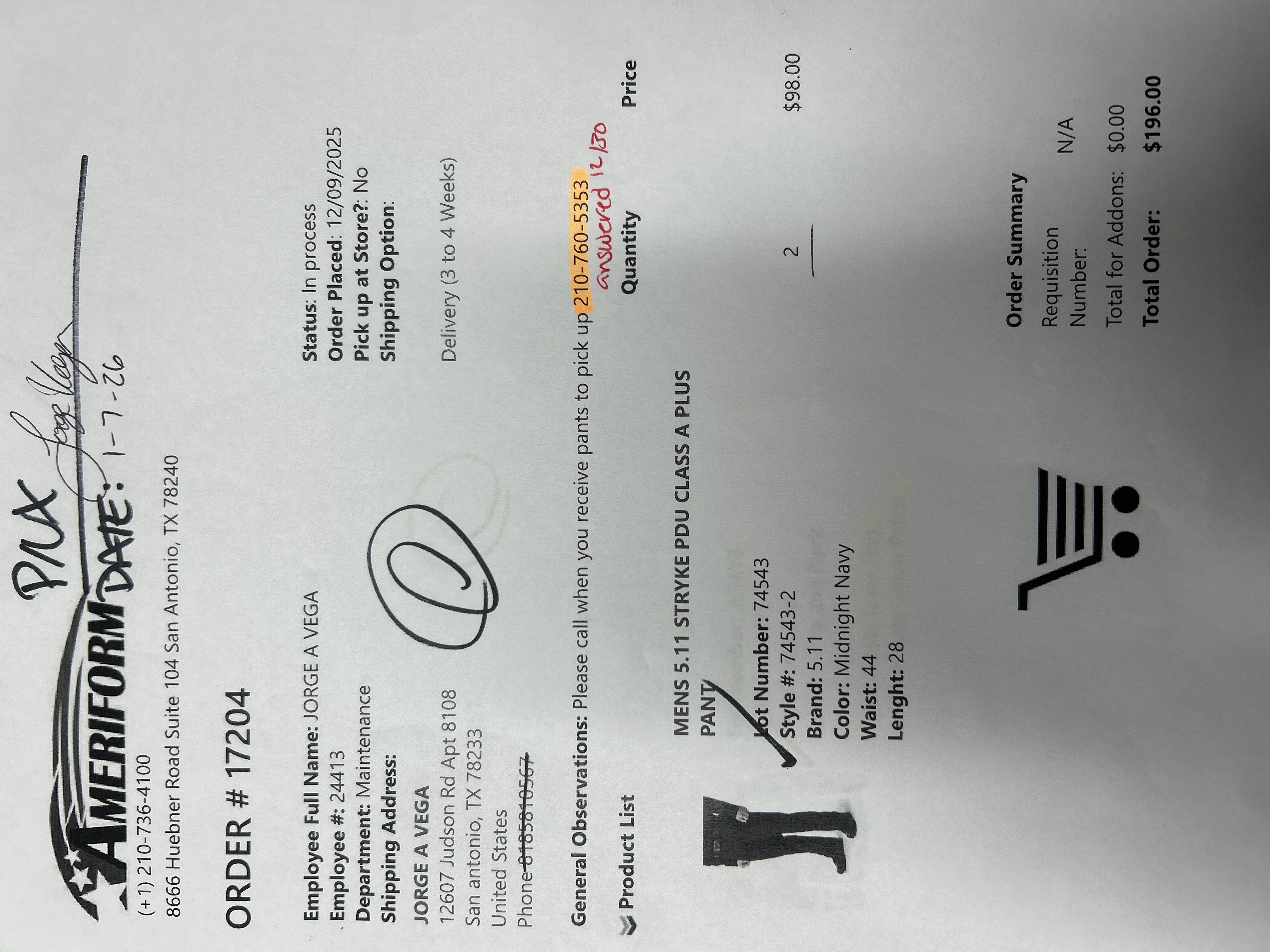 Please call when you receive pants to pick up 210-760-5353