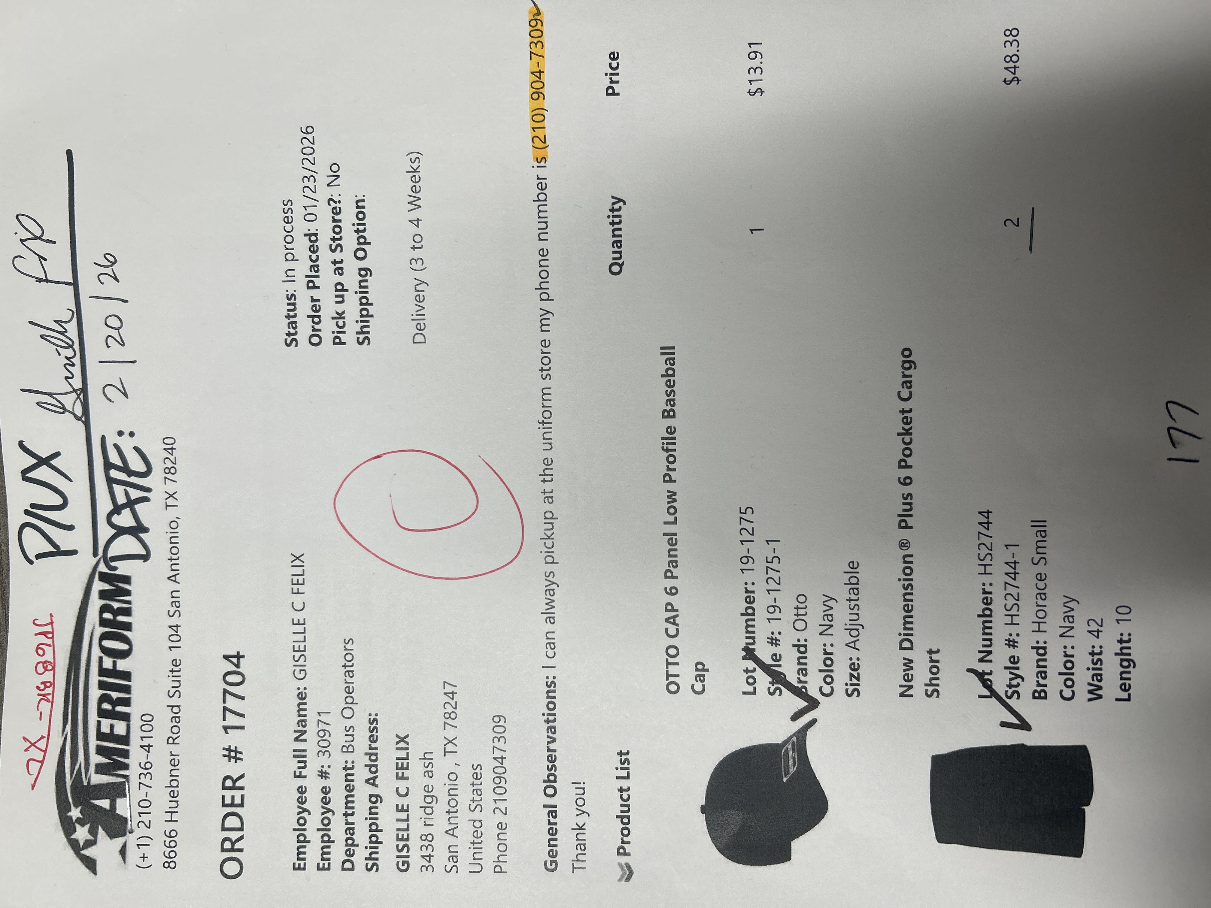 I can always pickup at the uniform store my phone number is (210) 904-7309 Thank you!