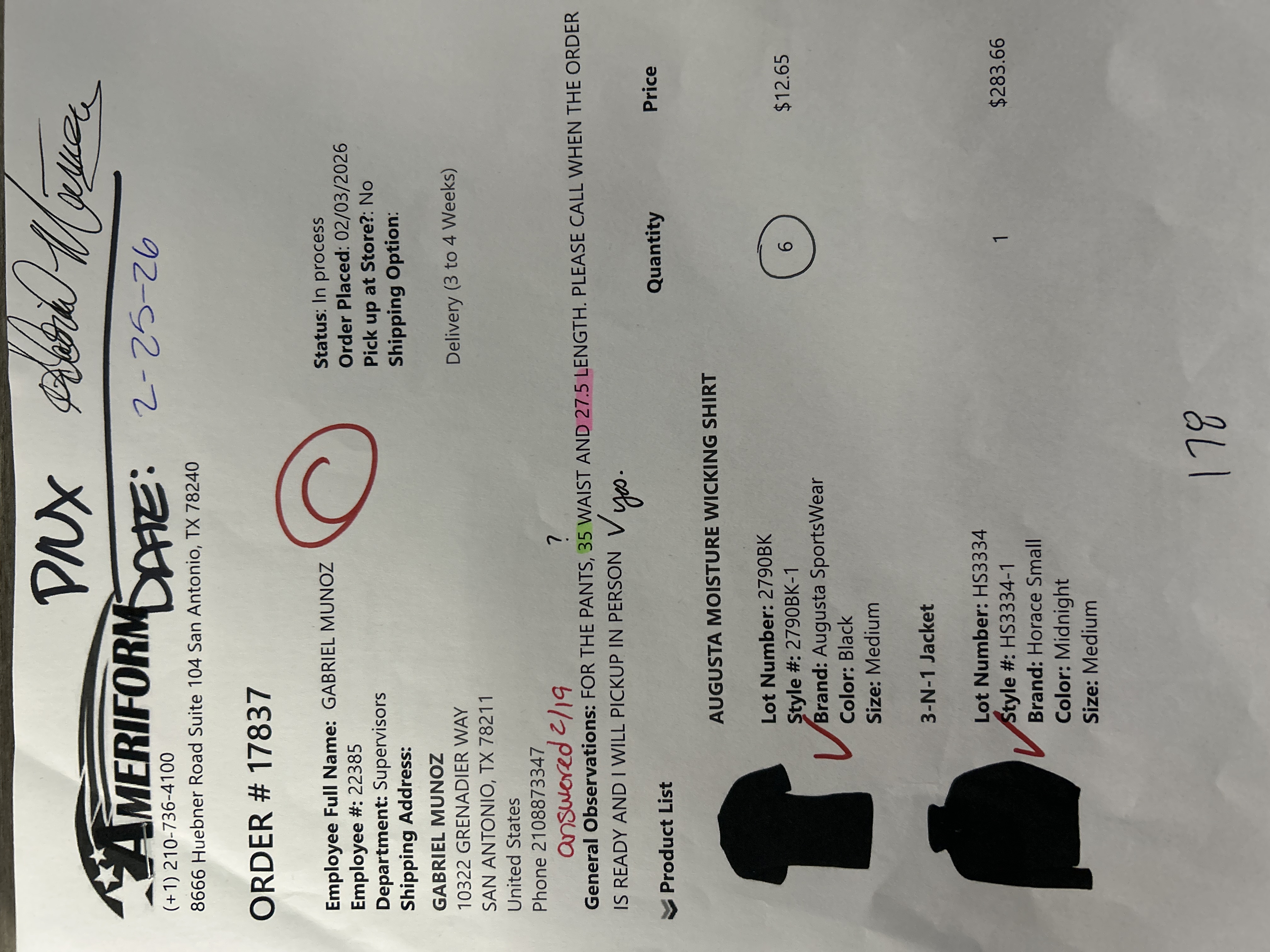 FOR THE PANTS, 35 WAIST AND 27.5 LENGTH. PLEASE CALL WHEN THE ORDER IS READY AND I WILL PICKUP IN PERSON